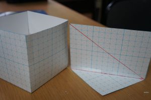 生徒たちは、最初「ええー?1mじゃないの?」と言いました。前回も、棒を収める箱を作るとき、棒と同じ形に、つまりふで箱のような細長い箱を作る人が大半でした。斜めの利用に思い当たったのは、一人だけでした。