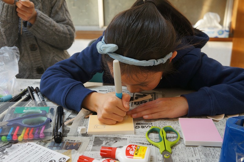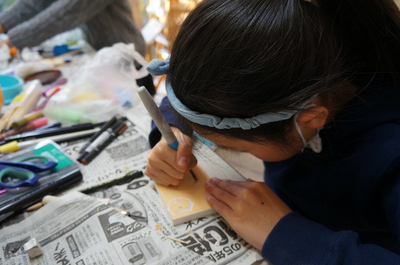 Akoちゃんは「今日は作りたいものがある」と言って、お友達にあげるプレゼントづくりをしました。ファンシーな茶色い紙袋に新聞紙をちぎって詰め、画用紙で動物の手足を付けます。うさぎができました。残りの時間は消しゴムハンコをしました。