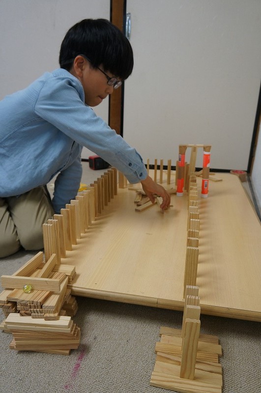 最後は、ドミノでひとレースしました。Chi君の発案で、置き方は、たてではなくて、横がよいことが分かりました。盛り上がり、1着はTo君でした。