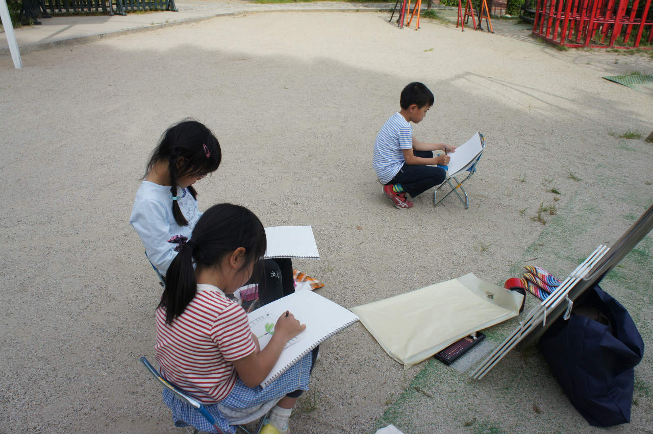 春学期に入って、やっと天候に恵まれましたので、今日は外で描くことにみんな賛成してくれました。