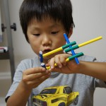 足が立ちました。「棒を同じ長さに切りそろえる」というのも、初めての経験です。最初、「はさみがかたい」と言って、切りにくそうにしていましたが、はさみの先っぽではなくて、奥を使うことを教えると、すんなりと切れるようになりました。