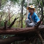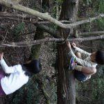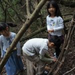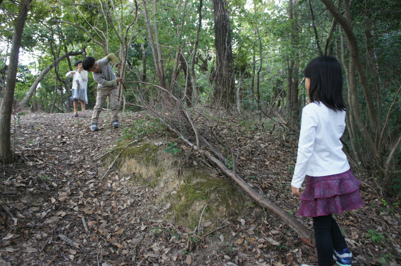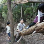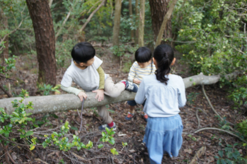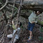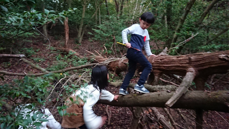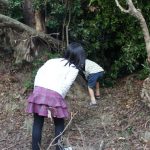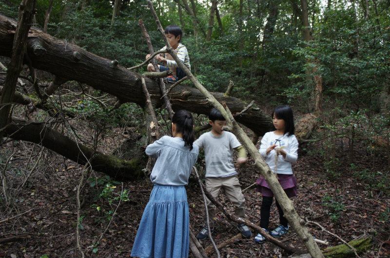 みんなはひと目見て、その2つの木と地面とで囲まれた空間に魅了され、早速基地づくりが始まりました。