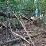 時おり道を塞いでいる倒木をくぐったりまたいだりしながら、道なき道を行くと、少し開けた谷間があり、倒れて斜めになった木を別の木ががっしりと受け止めている場所がありました!