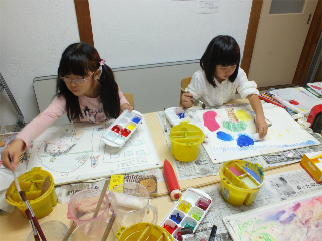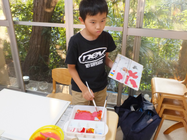 絵は画用紙の上で、どんどん変わっていくし、変わっていける(つまり、ある程度の修正もできる)のですから、そうした感覚を「絵の具を『置いて』『動かす』」ことを通して掴んでほしいと思いました。(パレットの使い方の練習も兼ねています)