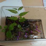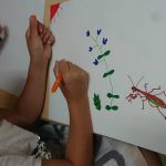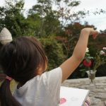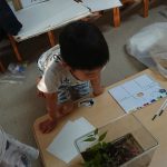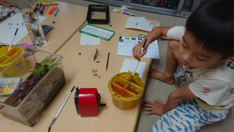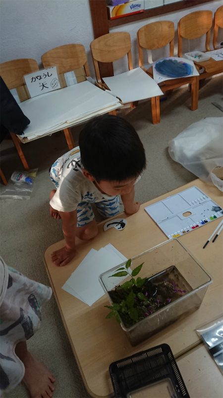 切り花や観賞用のカボチャ(ハロウィンにちなんで)などのモチーフがありましたが、Kikoちゃん、Honoちゃんは、それらを外に連れて行って、どの場所で描くのが良いか考えました。Rちゃんは室内で静かに集中して描くことを選びました。A君は「虫を見つけて描く」と心にきめて、虫取り網を手に奔走しました。「何としても自分で見つけるぞ」という執念が感じられました。
