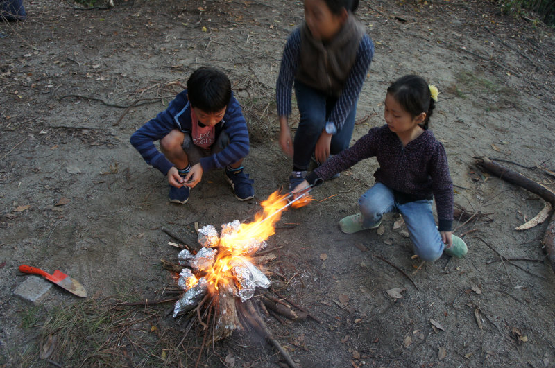 みんなで力をあわせ、殆ど私の手助けを必要とせず、焚き火をつくることができるようになりました。焼きリンゴも、じゃがいもも大成功。