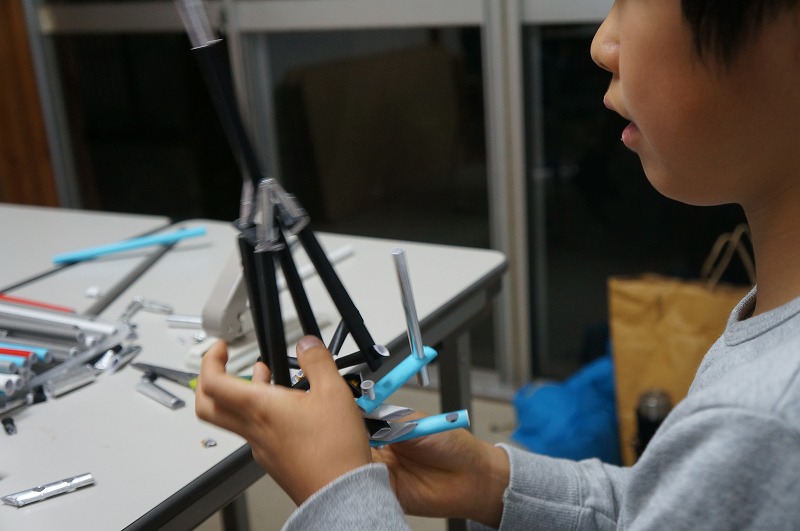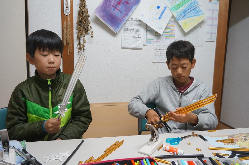 ひねもす(つくる4~6年)2019/11/25 公開日:2019/11/27 つくる 福西です。 (十字のモスピンを使って、剣を作る2人) 三本を同時にはめ込むのがムズカシイ。 はまった。 曲線部分の作り方を検討中。 シャチホコ。 剣を持つ手をぴったりに作るS君。 秋学期はこれでおしまいです。 次回は、12月9日(月)です。 家にあるひねもすの材料で、また作品を作ってきてください。 関連記事 つくるB(0302)ひねもす(2021/10/25)つくる3~4年(2016/9/26)ひねもす(つくる3~6年)2020/6『つくる』3年・4〜6年クラス便り(2018年2月) 投稿ナビゲーション ひねもす(つくる4~6年2019/11/11)ひねもす(つくる4~6年)2019/12/9