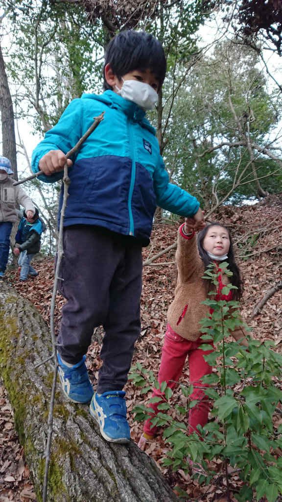 最後はやはり「あの谷」に辿り着き、みんなでザーッと滑り降り、今度はよじ登り、電車ごっこで山道を帰ってきました。かなり歩いてみなさんリフレッシュできたでしょうか。Tくんは落ち葉の海をクロールで泳いでいました!