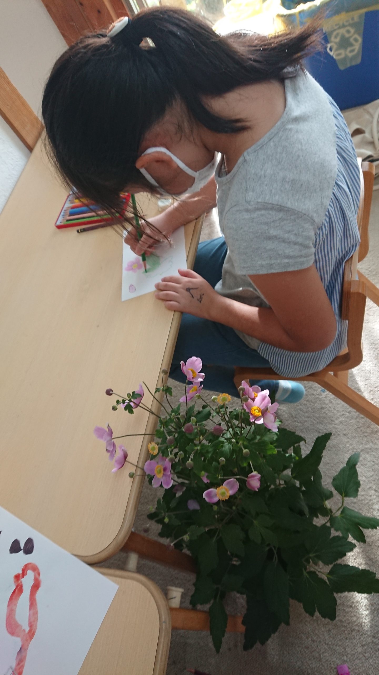 絵画では、Hinakoちゃんが秋明菊を写生し、Kahokoちゃんが、前学期から描いていた絵に加筆して仕上げました。