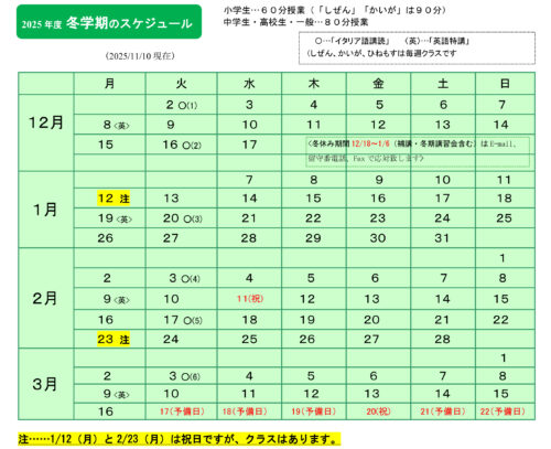 冬学期のスケジュール 公開日:2025/11/11 お知らせ 福西です。 山の学校の冬学期のスケジュールです。 冬学期は12月2日からスタート。 ただいま冬学期のお申込みを受け付け中です。 お申込みはこちら。 関連記事 2021-07-31 学びつつ年を重ねることば3~4年生では、次は『星モグラ サンジの伝説』を読みます!【再告知】4月17日(月)に、「英語特講」があります!2021-06-04 フランス語講読AとB秋学期から新しいテキスト講読開始「西洋近代思想の古典を読む」クラス、ガイダンス実施(7/19) 投稿ナビゲーション 11月「ラテン語の夕べ」のご案内