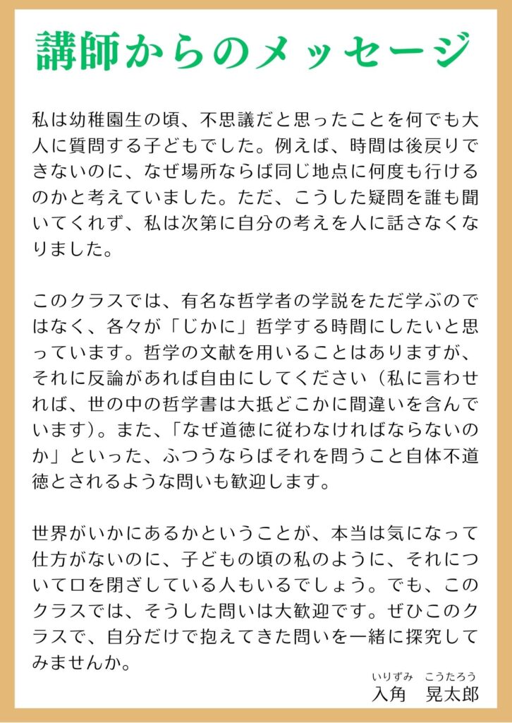 中高生の哲学 公開日:2026/03/04 お知らせ 福西です。 「中高生の哲学」クラスで、自分だけで抱えてきた問いを一緒に探究してみませんか? ご参加をお待ちしています。 【講師からのメッセージ】 関連記事 9/30(金)18:40より「フランス語入門」開講(初回体験含む)【再告知】「ラテン語初級文法」は、12/7から始まります!勉強相談会の一風景『ギリシア文学の国際性、今むかし』(「古典の夕べ」リポート2015年2月)3/23(水)「漢文」クラスガイダンス 投稿ナビゲーション 春期講習会のご案内(中高生)