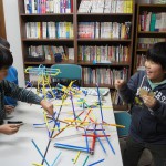 この日はモスジョイントを活用しました。ひねもすの基本は大モスと小モの組み合わせスですが、アイデアが冷めないうちにさっと形にするなら、ジョイントが便利です。ジョイントで作ったロボットは、歯車がついているようなかっこよさがありました。また四角い構造物が容易に作れるようになったせいか、ロボットにプロレスをさせる「リング」や、「本棚」を作っている様子も見られました。