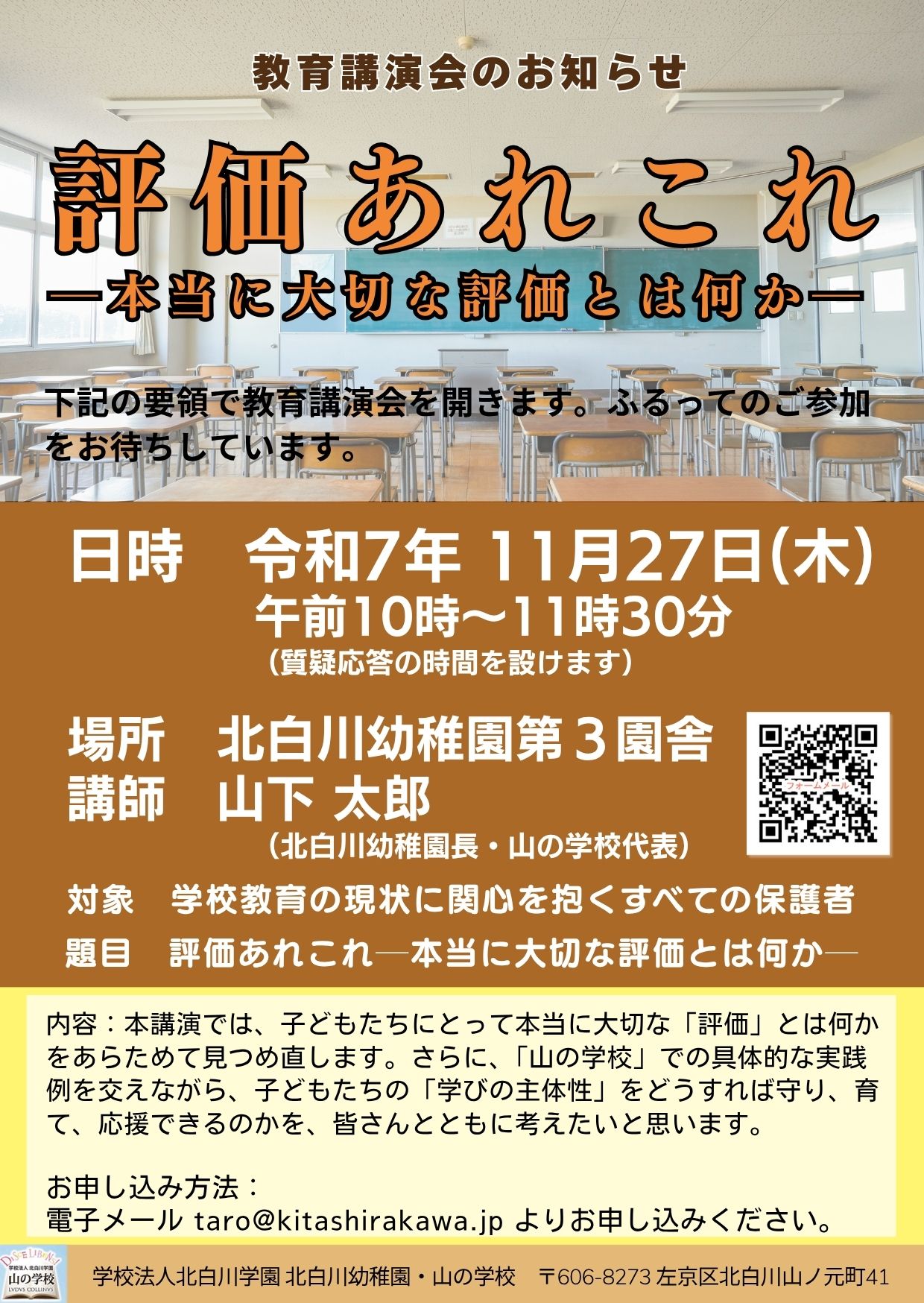 福西です。 下記の講演会を開催します(無料)。お問い合わせはこちら。 日時 令和7年 11月27日(木) 午前10時~11時30分 (質疑応答の時間を設けます) 場所 北白川幼稚園第3園舎 講師 山下 太郎(北白川幼稚園 […]