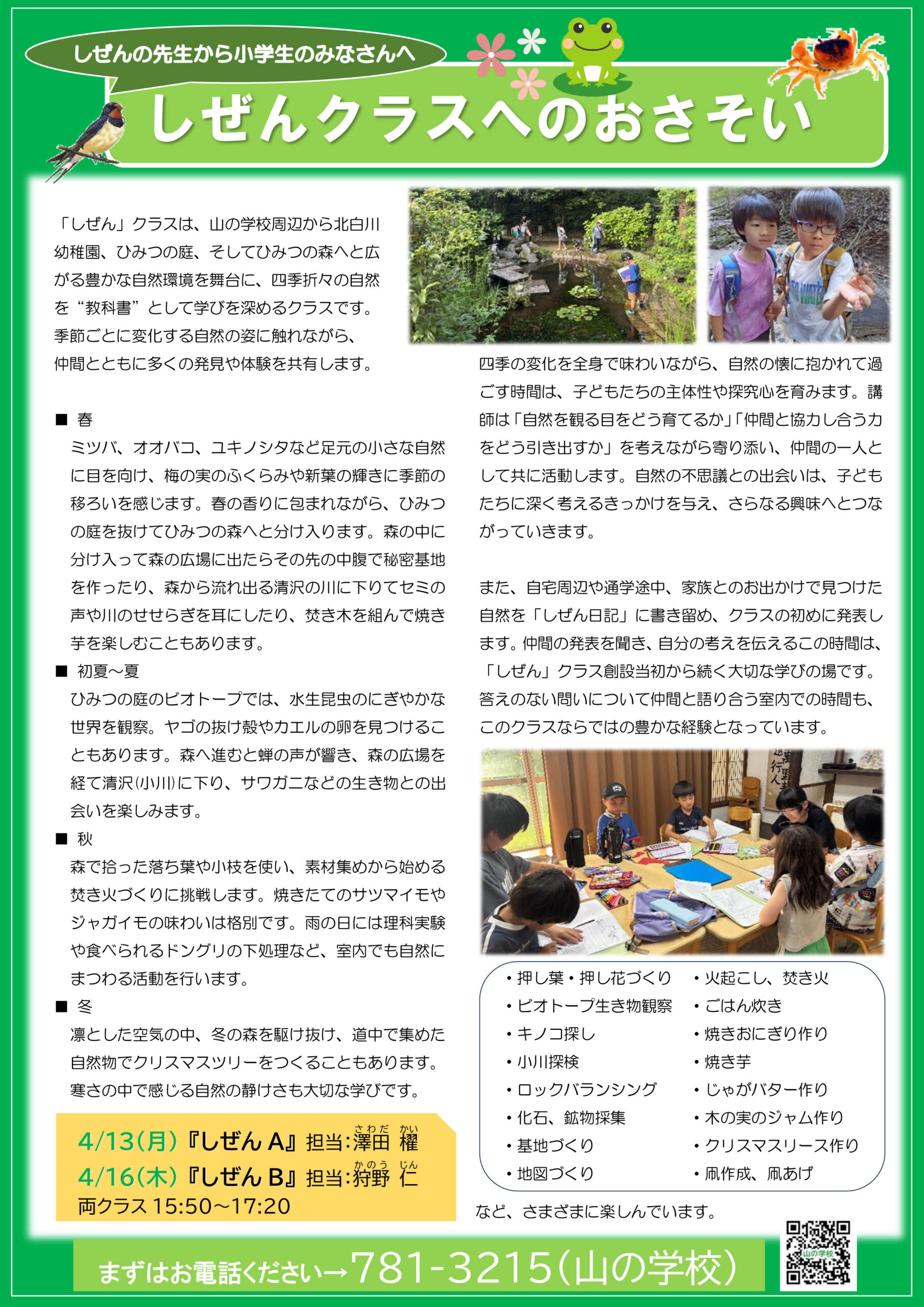 福西です。 「しぜんクラス」の受講生を募集中です。ぜひご検討ください。 「しぜん」クラスは、山の学校周辺から北白川幼稚園、ひみつの庭、そしてひみつの森へと広がる豊かな自然環境を舞台に、四季折々の自然を“教科書”として学び […]