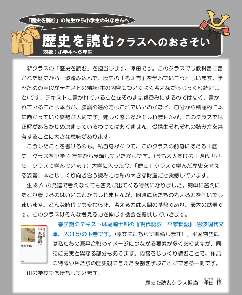 山下です。 四月から小学生対象の「歴史」クラスが誕生します(4年生以上)。 厳密には誕生と言うよりも復活です。 初代「歴史」は、今回クラスを担当する澤田櫂先生が小学4年生の時、「歴史を学ぶクラスを作ってください」と直訴さ […]